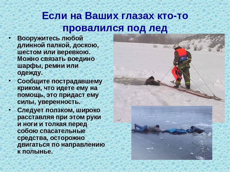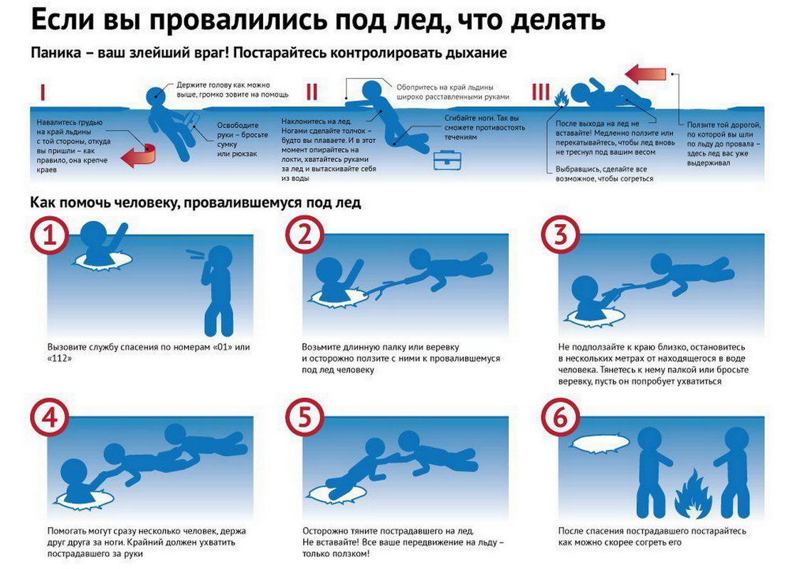 - выбравшись из полыньи, откатывайтесь, а затем ползите в ту сторону, откуда шли: ведь лед здесь уже проверен на прочность.