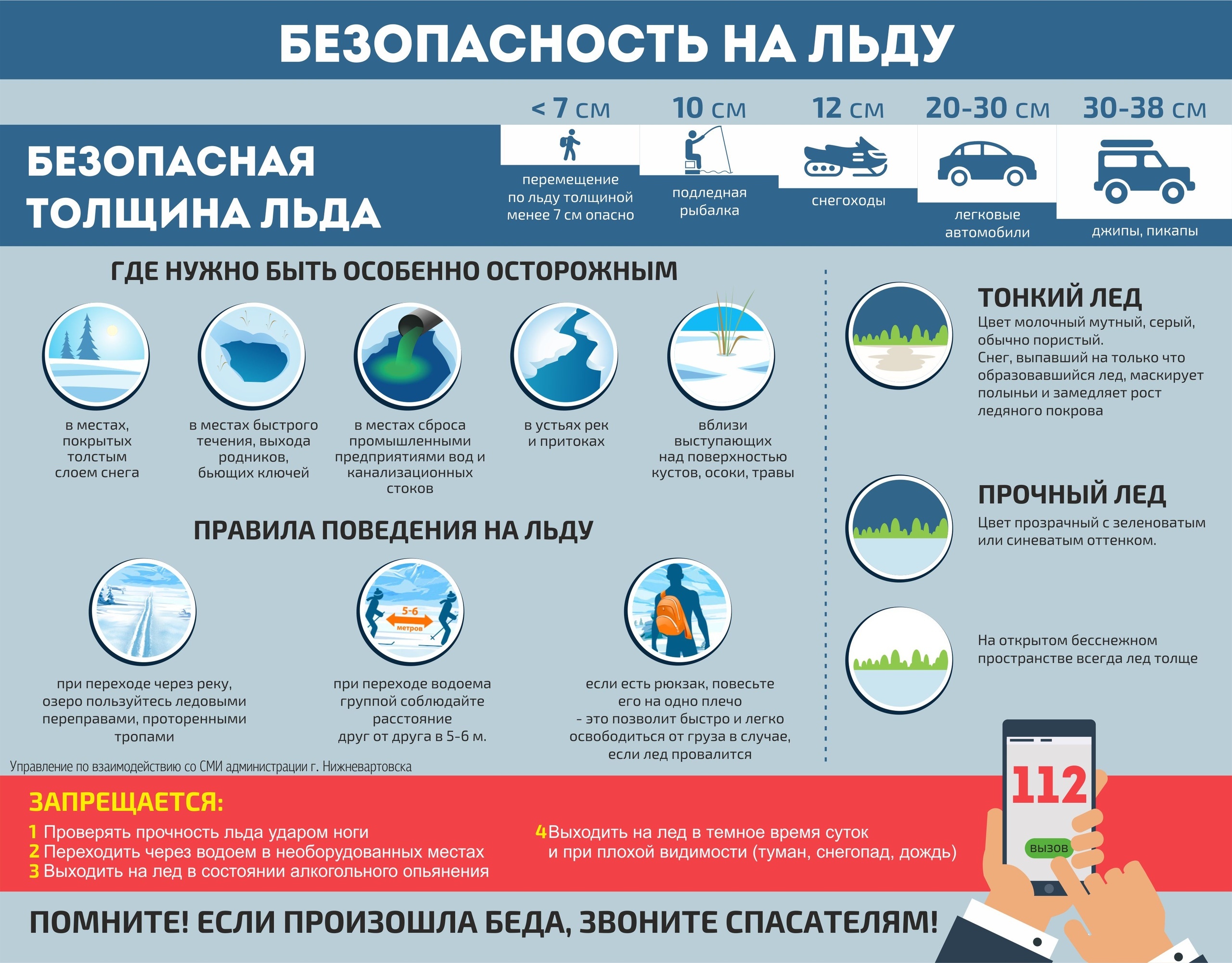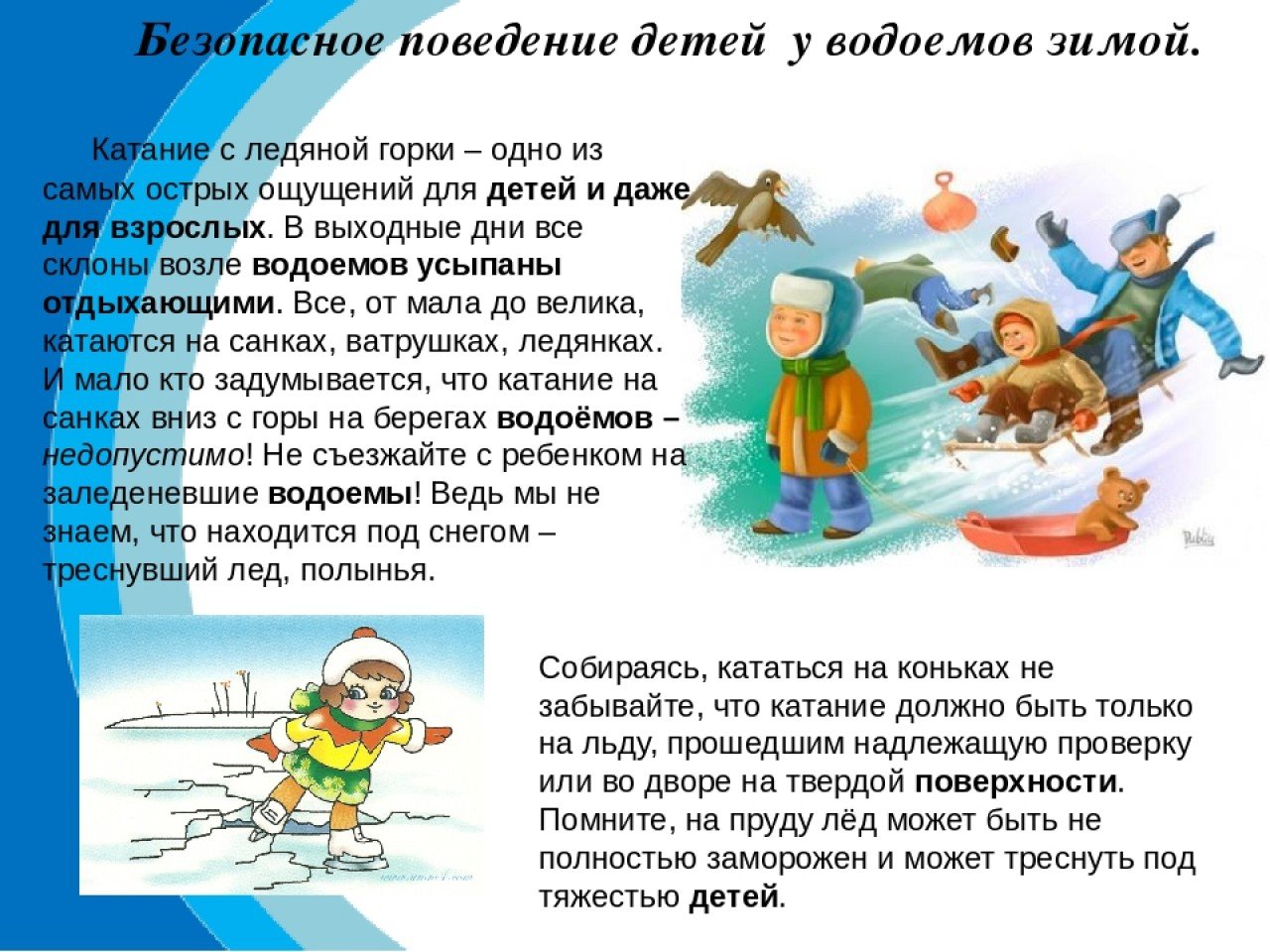 Причиной травматизма и гибели детей на водных объектах, покрытых тонким ненадежным слоем льда, являются неосторожность, игры, катание на санках и коньках, а так же просто скольжение по тонкому льду. Лед на водоемах нашего города в зимний период не прочный, неоднороден по толщине и структуре. Складывающийся метеорологический прогноз с резкими колебаниями температур от минусовой до плюсовой, с выпадением осадков в виде дождя и снега еще более осложняют обстановку. Скрепленный вечерним или ночным холодом, он еще способен выдерживать небольшую нагрузку, но днем, быстро нагреваясь от просачивающейся через него талой воды, становиться пористым и очень слабым, хотя сохраняет достаточную толщину. Как правило, водоемы замерзают неравномерно, по частям: сначала у берега, на мелководье, в защищенных от ветра местах, а затем уже на середине. На одном и том же водоеме можно встретить чередование льдов, которые при одинаковой толщине обладают различное прочностью и грузоподъемностью.